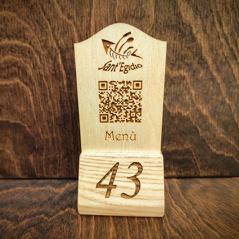 Realizzato a mano nel nostro laboratorio e inciso con precisione laser, può essere personalizzato con loghi, testi, numerazioni e QR code per l’accesso rapido a menù digitali, informazioni o servizi.